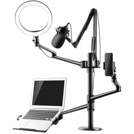 • Position réglable : 4 bras modulables : adaptateur Vesa 75 / 100, support pour pc portable, smartphone, tablette, microphone et bague adaptateur pour reflex et caméscope